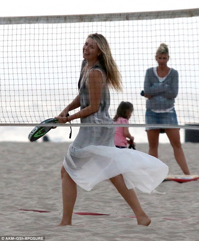 Тенисистката бе снимана да е в центъра на купона на плаж в Хермоса Бийч, Калифорния. Маша не е изоставила напълно и тренировките по време на почивката си, като само го е заменила с плажен тенис.