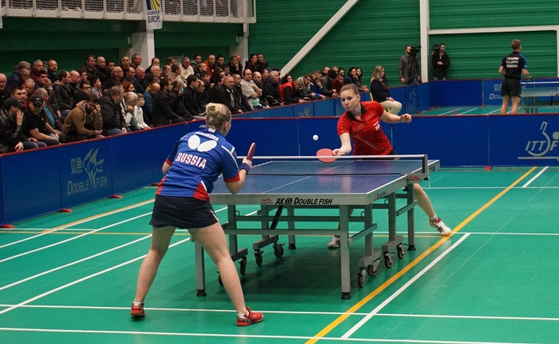 При жените националките отстъпиха с 0-3. В първата среща 17-годишната Мария Йовкова стигна до геймпойнт в продължението на първия гейм при 11:10, но не успя да го реализира и загуби от Мария Маланина с 0-3 (11:13, 9:11, 4:11).