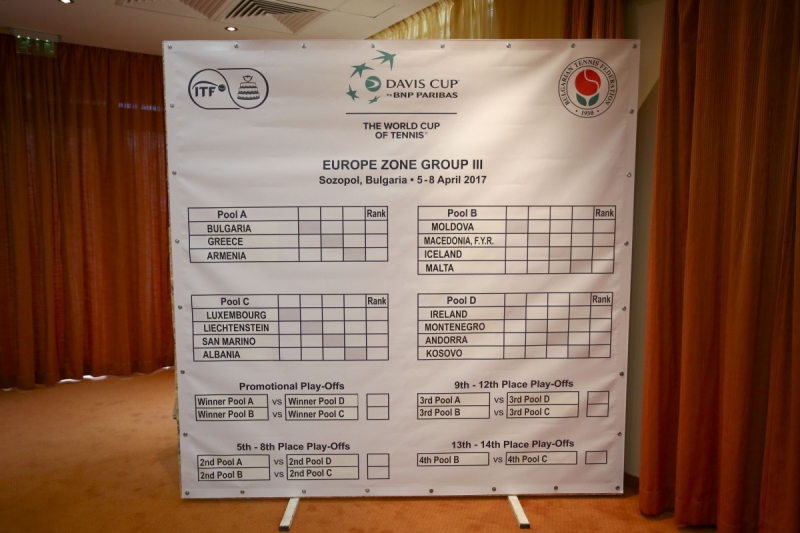Беше изтеглен жребият за двубоите от трета група на зона "Европа" за Купа "Дейвис", които ще се проведат от утре до 8 април в "Санта Марина" край Созопол. Отборът на България е в група А, която е единствената с три състава. Съперници на избраниците на Тодор Енев са тимовете на Гърция и Армения.