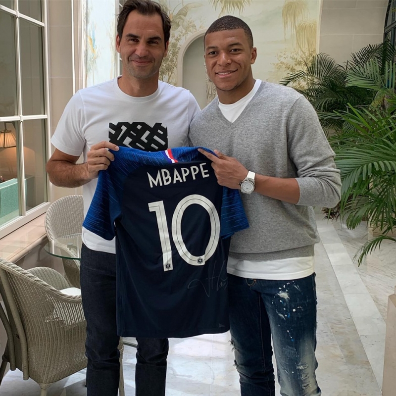 Федерер се похвали със снимка с младия нападател на ПСЖ, а от фотоса става ясно също, че тенисистът се е сдобил и с фланелка на футболиста. По всяка вероятност Маестрото е върнал жеста и е дал някоя от своите тенис ракети на Мбапе.