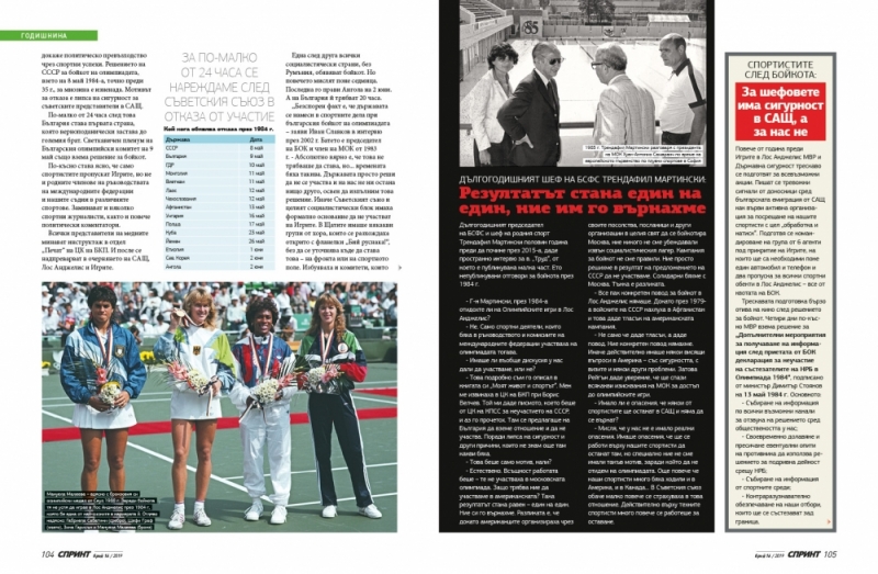 Дългогодишният председател на БСФС и шеф на родния спорт Трендафил Мартински половин година преди да почине през 2015-а, даде пространно интервю за в. „Труд“, от което е публикувана малка част. Ето непубликувани отговори за бойкота през 1984 г.