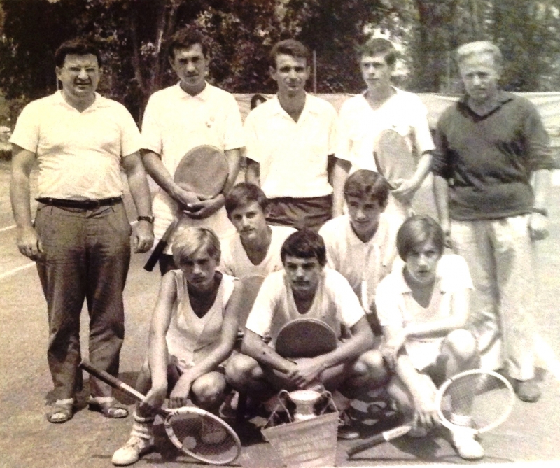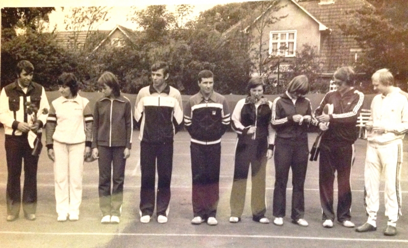 (Откриване на международния турнир в Циновиц (ГДР) в началото на 80-те години. От ляво надясно: водачът на българския отбор Иван Драганов- виден деятел на тениса в Хасково, Диана Москова, Мануела Малеева, Любен Генов, Любомир Петров. До нашите следват състезателите на ЧССР)