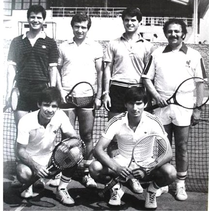 („Хасково” става републикански отборен първенец през 1984 г. Прави от ляво надясно: Матей Пампулов, Л. Петров, Божидар Пампулов, д-р Пюзант Касабян. Приклекнали Атанас Георгиев и Радомир Тонев)