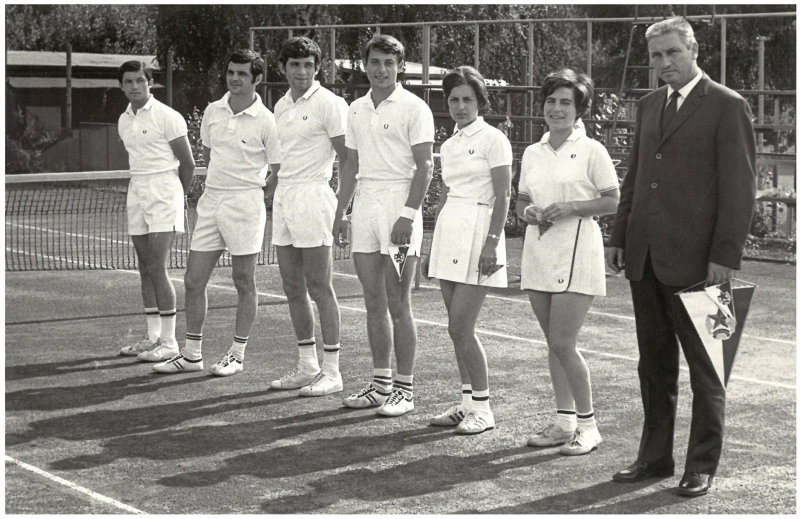 (Отборът на „Спартак" /София/ от края на 60-те години. От ляво надясно: Цветан Цолов, Стефан Цветков, Любен Генов, Илия Илиев, Елена Щерева –Романска, Надежда Теодорова и Михаил /Милчо/ Михайлов- старши треньор и първи наставник на Цъфа и Цолето)