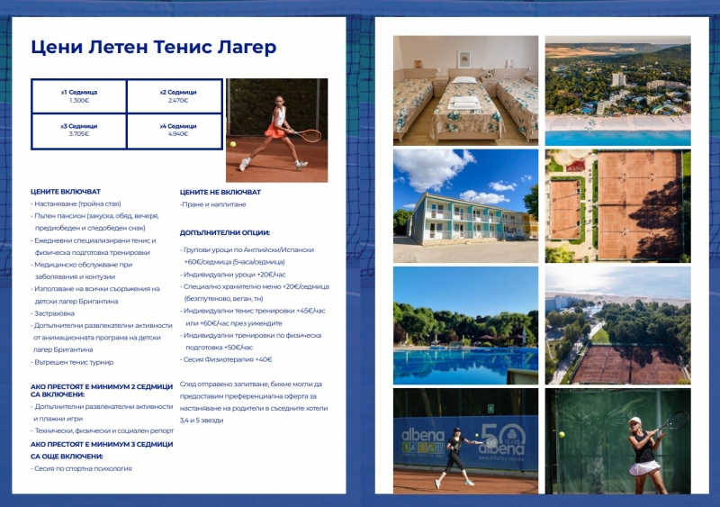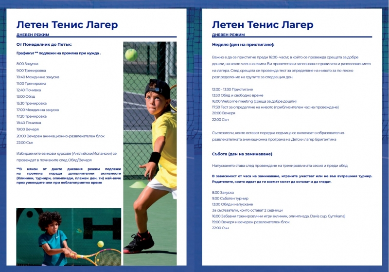 Тенис програмите са насочени за деца над 8-годишна възраст. Лагерът започва на 23.06.2024 г. и ще продължи до 24.08.2024 г. Организаторите са предвидили различни развлекателни активности в зависимост от продължителността на лагера.