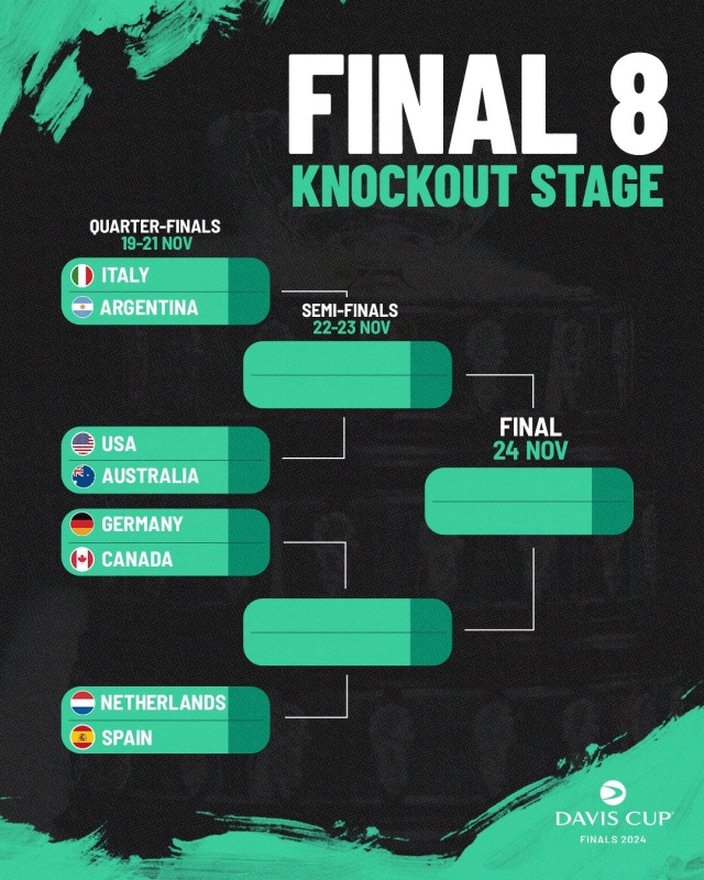 Настоящият шампион Италия ще се изправи срещу Аржентина на четвъртфиналите. Очаква се във финалната фаза да участват всички най-добри тенисисти, като към италианците ще се присъединят световният номер 1 Яник Синер и Лоренцо Музети, които пропуснаха груповата фаза в Болоня.