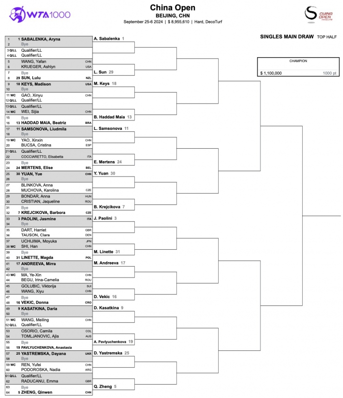 Виктория Томова ще играе срещу Леся Цуренко в първия кръг на турнира по тенис на твърди кортове WTA 1000 в Пекин с награден фонд близо 9 милиона евро.