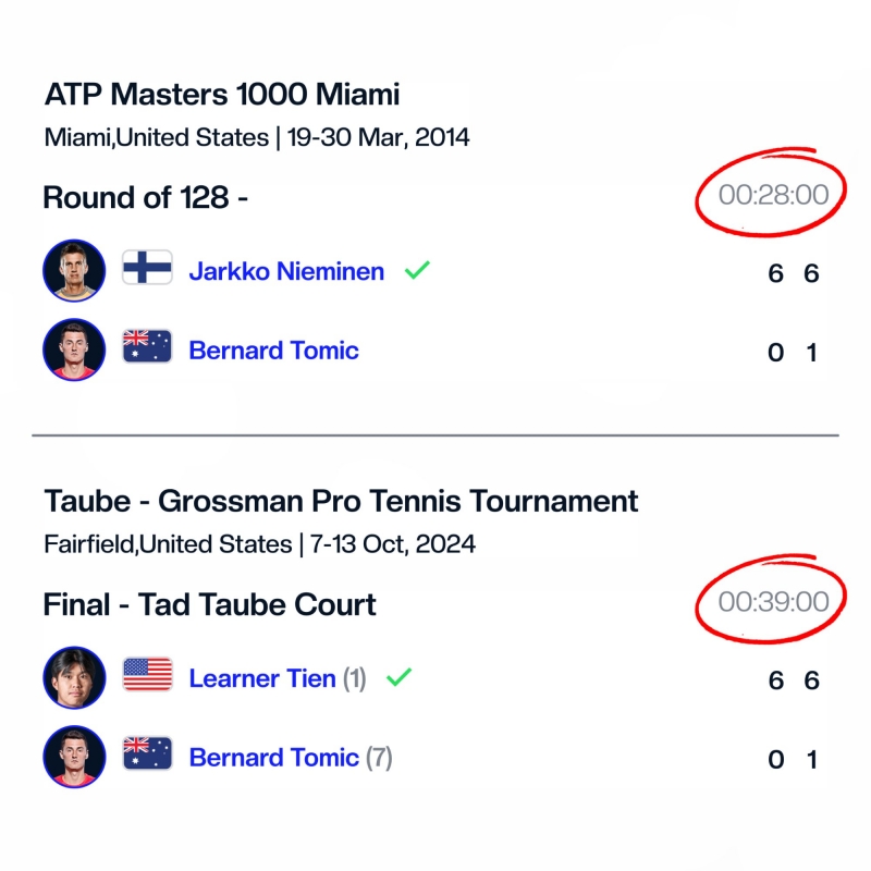 Любопитна подробност е, че Томич държи и рекорда за най-бърза загуба изобщо. Той беше поставен през 2014 година в мач от първия кръг на Мастърса в Маями. Тогава той отстъпи отново с 0:6, 1:6 пред финландеца Ярко Ниеминен за само 28 минути.