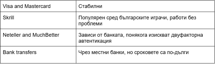 Въпреки това самият сайт работи добре дори при нестабилен интернет, демо версиите на игрите се зареждат бързо, а структурата на личния акаунт е логична. Инструментите за плащане са адаптирани към българския пазар - и това е един от основните аргументи в полза на платформата.