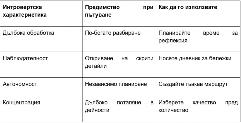 Пътуване за интроверти изисква различен подход от този, който се препоръчва в повечето туристически ръководства. Докато екстровертите черпят енергия от социалните взаимодействия и динамичните дейности, интровертите се нуждаят от време за вътрешна обработка и възстановяване.