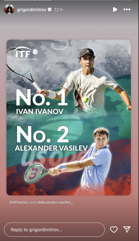 Григор Димитров сподели на стори в своя инстаграм публикацията на ITF относно успеха на двамата свои млади сънародници Иван Иванов и Алкександър Василев, които гордо заемат първа и втора позиция в ранглистата при юношите.